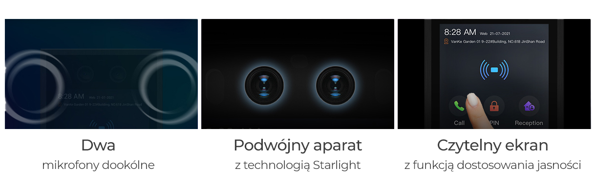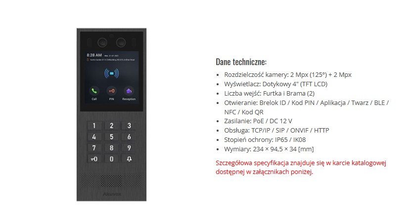 - Rozdzielczość kamery: 2 Mpx (125°) + 2 Mpx Wyświetlacz: Dotykowy 4" (TFT LCD) Liczba wejść: Furtka i Brama (2) Otwieranie: Brelok ID / Kod PIN / Aplikacja / Twarz / BLE / NFC / Kod QR Zasilanie: PoE / DC 12 V Obsługa: TCP/IP / SIP / ONVIF / HTTP Stopień